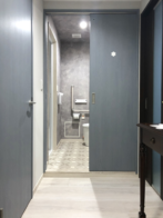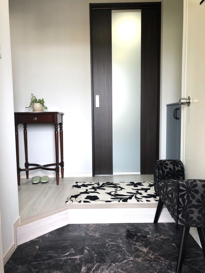 基本は白黒のモノトーンとダークブラウンでシックな雰囲気で統一し、アクセントにブルーグレーオークの建具をチョイスし、爽やかさがプラスされました。