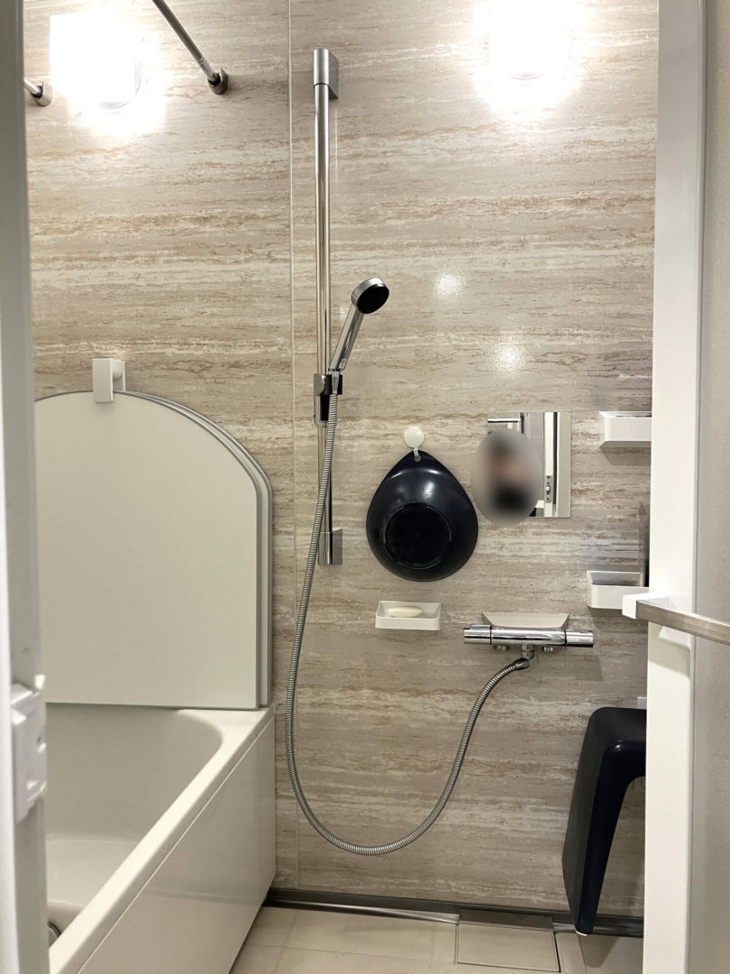 浴室はタカラスタンダード「グランスパ」。タカラならではの「高品位ホーロー」を使用した壁パネルです。 汚れが染み込まず、サッと拭くだけで美しさをキープ。磁石が付く特性を活かして浮かせる収納で、カビの発生を防ぎキレイを保ちます。