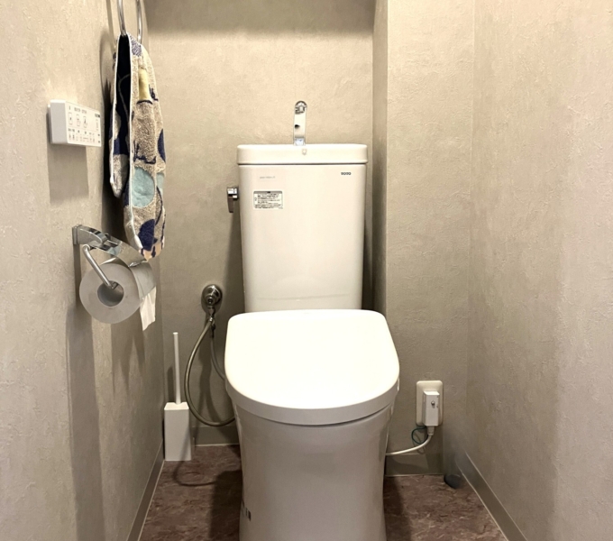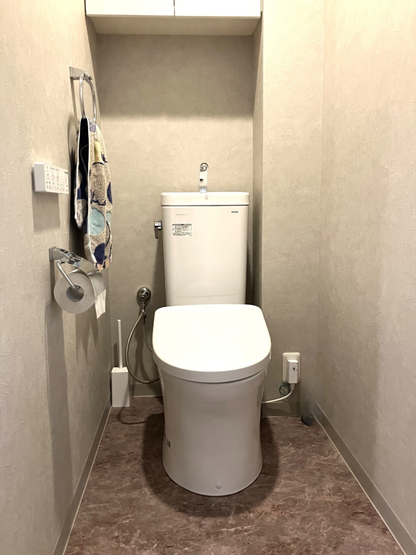 トイレはマンションリフォーム用TOTO「ピュアレストMR」と「アプリコット」を採用し、内装も貼り替えて一新しました。
